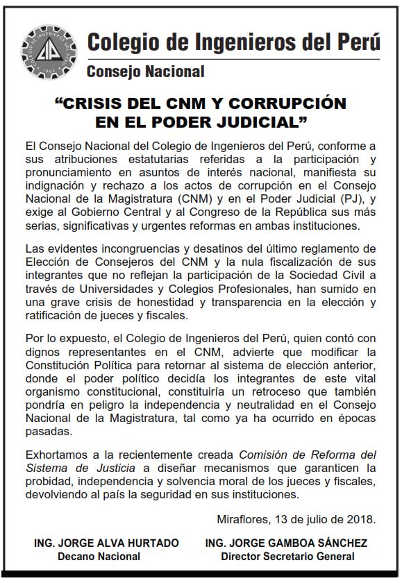 Crisis del Consejo Nacional de la Magistratura y Corrupción en el Poder Judicial PronunciamientosPor Fernando Rojasjulio 14, 2018