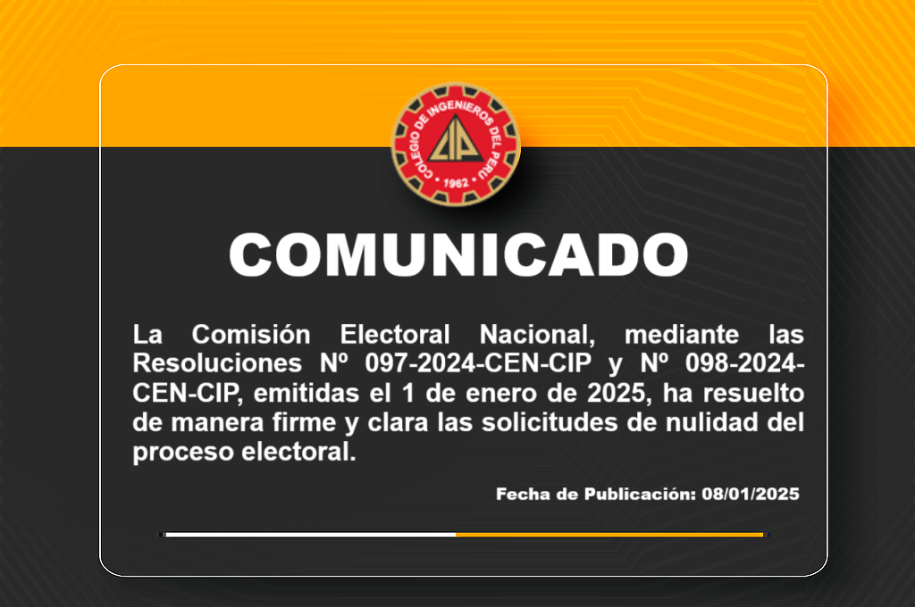 08/01/2025 La Comisión Electoral Nacional, mediante las Resoluciones Nº 097-2024-CEN-CIP y Nº 098- 2024-CEN-CIP, emitidas el 1 de enero de 2025, ha resuelto de manera firme y clara las solicitudes de nulidad del proceso electoral.