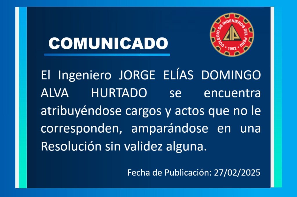 27/02/2025 El Ingeniero JORGE ELÍAS DOMINGO ALVA HURTADO se encuentra atribuyéndose cargos y actos que no le corresponden, amparándose en una Resolución sin validez alguna.