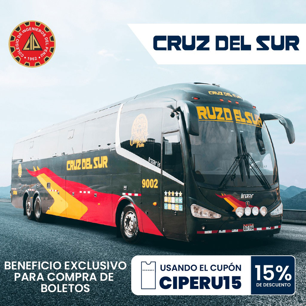 “Gracias al convenio entre el Colegio de Ingenieros del Perú (CIP) y Cruz del Sur, ahora puedes disfrutar de un 15% de descuento en la compra de tus boletos.