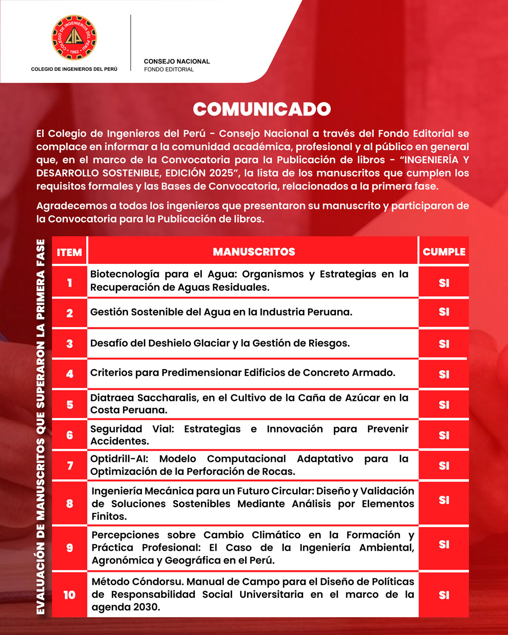 CONVOCATORIA PARA LA PUBLICACIÓN DE LIBROS – COLEGIO DE INGENIEROS DEL PERÚ, «INGENIERÍA Y DESARROLLO SOSTENIBLE, EDICIÓN 2025»