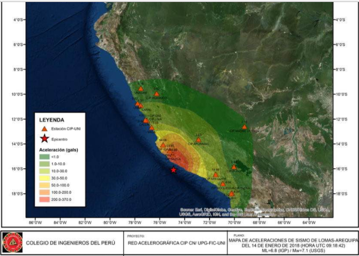 Mapa actualizado de isoaceleraciones sismo de Lomas-Acari del 14/01/18. Red CIP-UNi CompartirCompartir con FacebookCompartir con Twitter