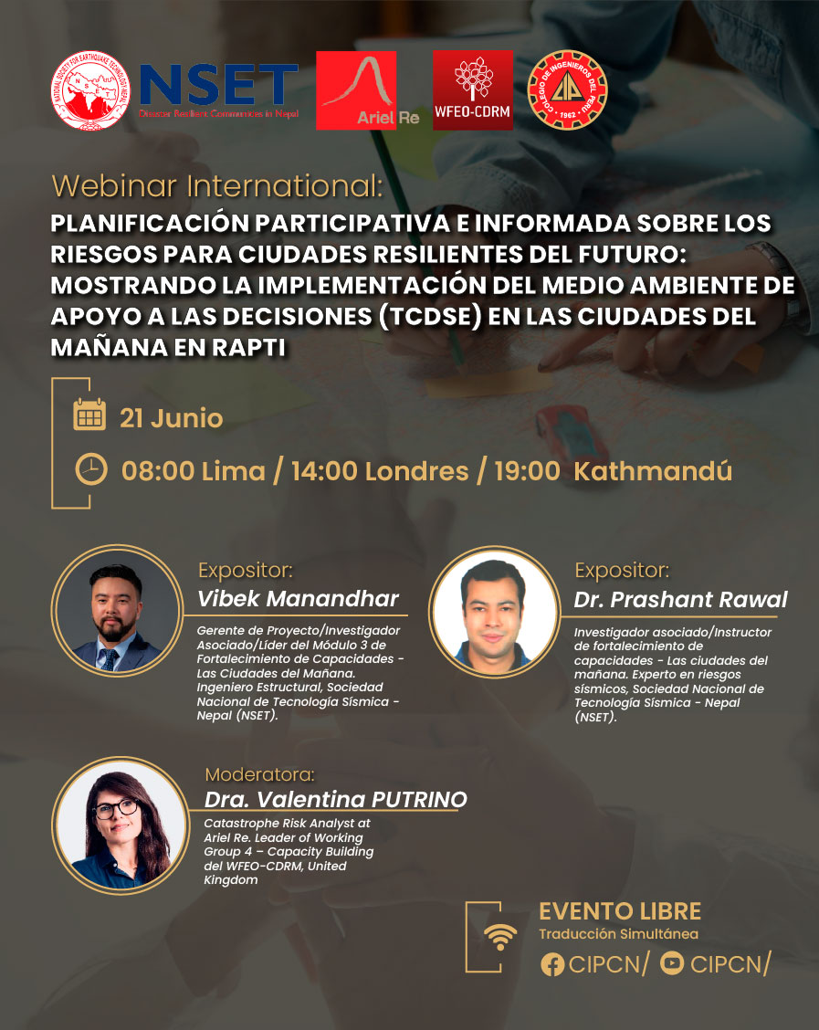 El Comité Técnico sobre Gestión del Riesgo de Desastres de la Federación Mundial de Organizaciones de Ingeniería (WFEO) y el Colegio de Ingenieros del Perú (CIP) están organizando este importante evento a realizarse el próximo 21 de junio a las 08:00 hrs. en Lima, 14:00 horas en Londres y 19:00 hrs. en Katmandú.