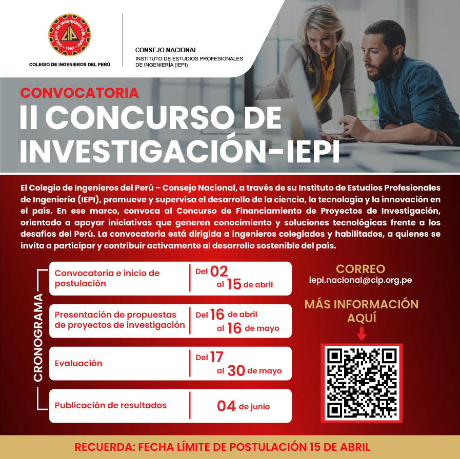 El Instituto de Estudios Profesionales de Ingeniería (IEPI), órgano profesional de estudio, difusión e investigación del Colegio de Ingenieros del Perú, tiene como finalidad proveer al país de ingenieros con ética y profesionalismo que contribuyan al desarrollo de la nación.